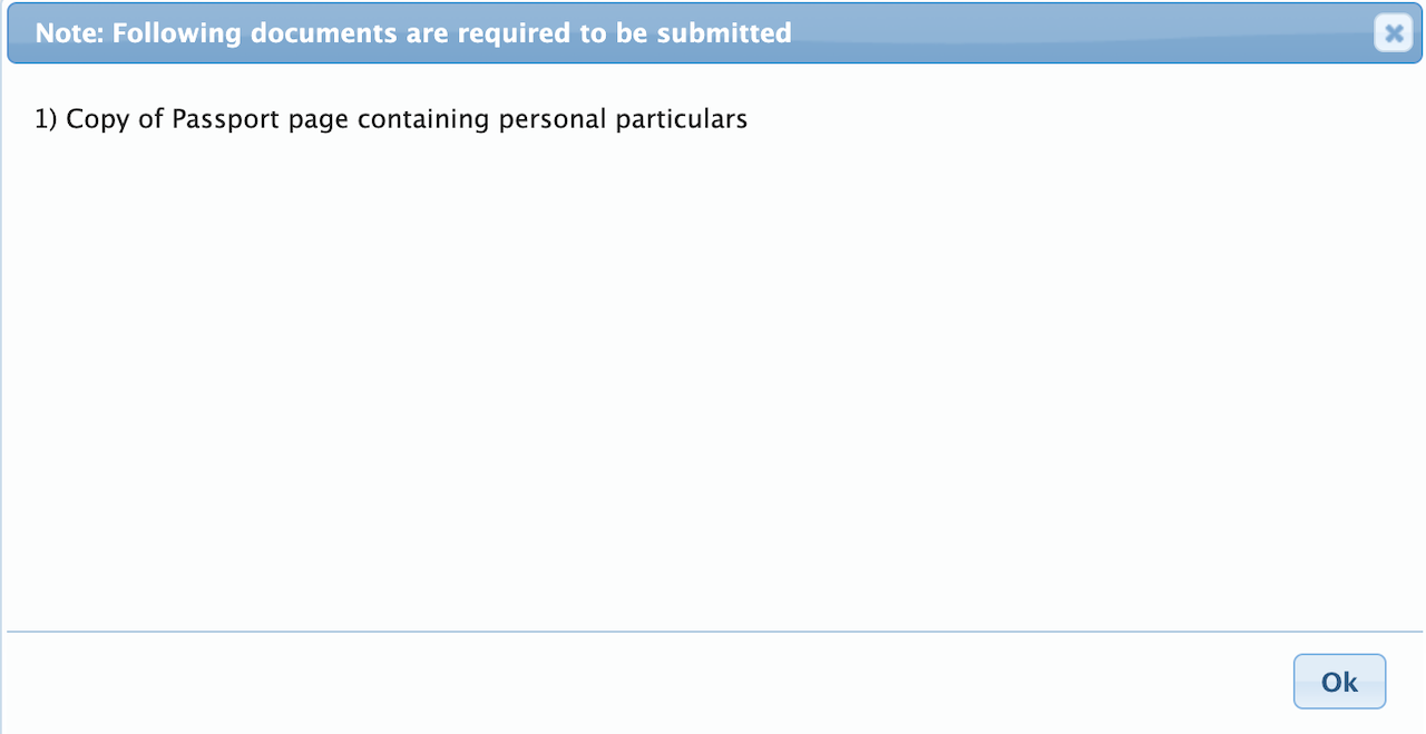 Note: Following documents are required to be submitted 1) Copy of Passport page containing personal particulars(注意:以下の書類の提出が必要です。 個人情報が記載されているパスポートページのコピー)