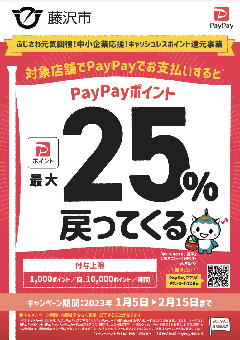 - 特典:決済金額の最大25%のPayPayポイントをPayPayユーザーへ付与