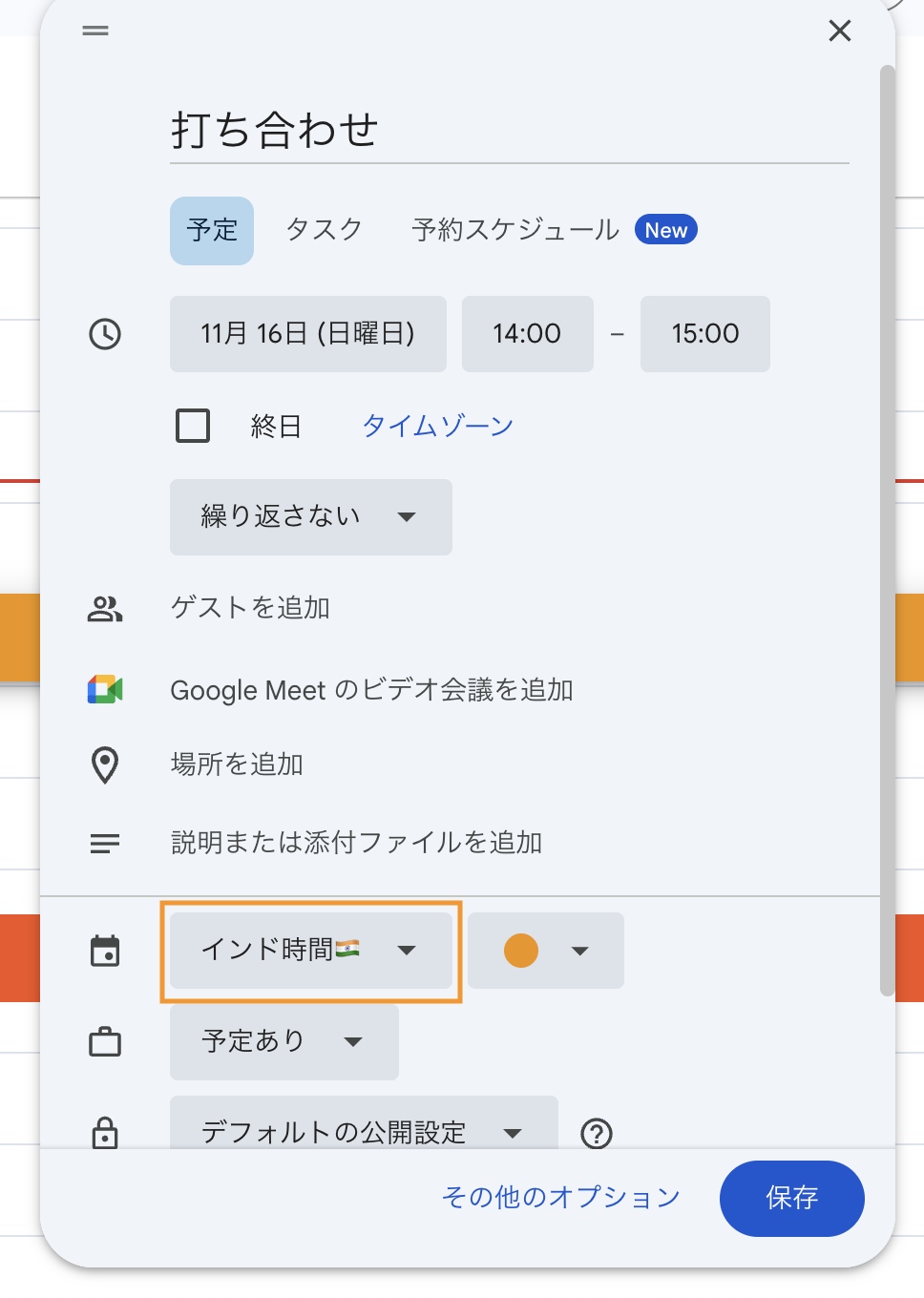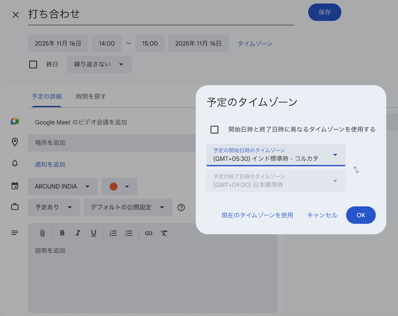 いつものカレンダーに予定を追加するときは、タイムゾーンをインド時間に変更します。